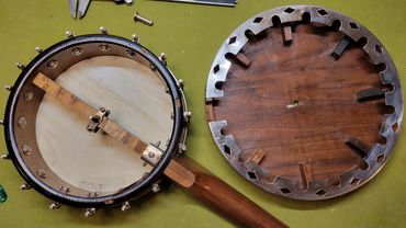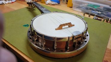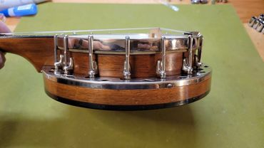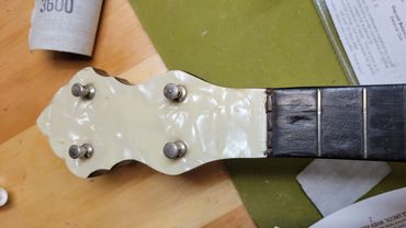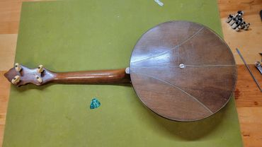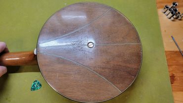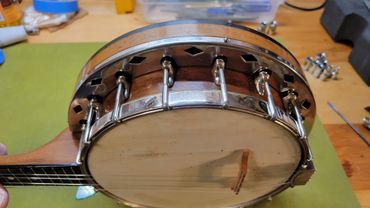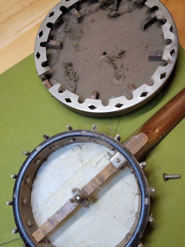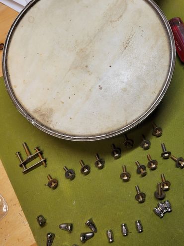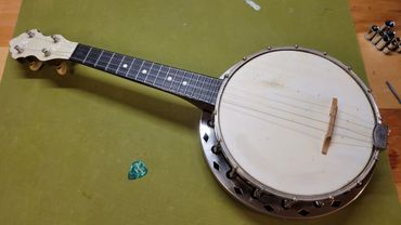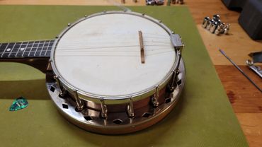 This banjolele came in needing some love and care. Another instrument abused by long term storage under poor conditions. Insides were dirty and greasy. Hardware was corroded. The drum skin was stained. Some elbow grease, metal cleaner, and Mr Clean Magic eraser did the trick. New strings and ready to play again.