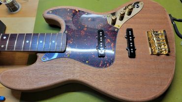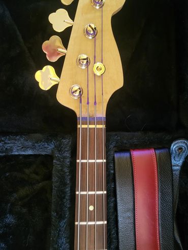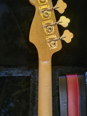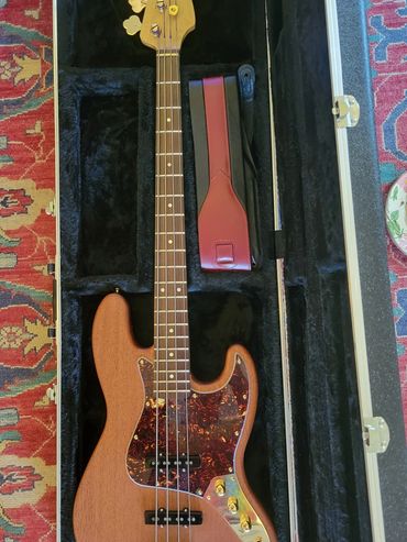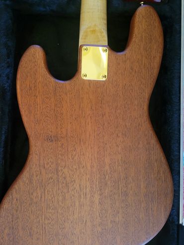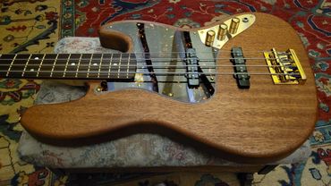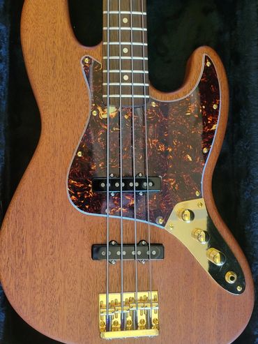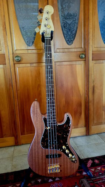 I never really liked the Mexican Fender Precision Bass I bought from a friend 20 years ago. When playing with my band back in North Caroline years ago I had access to a Fender Jazz Bass. Absolutely loved it. So I decided I'd make one for myself. Got a nice slab of Sapele Mahogany and some flamed maple from Home Depot (believe it or not) for the neck. Indian Rosewood fretboard, gold hardware, gold EVO frets. StewMac pickups.