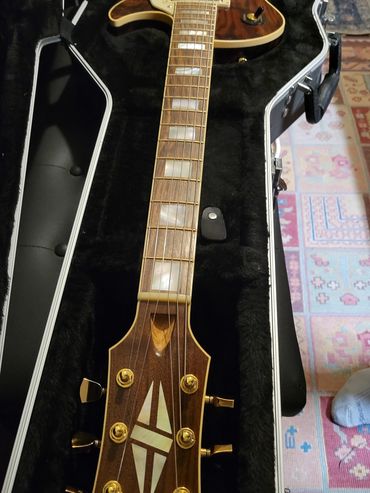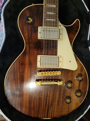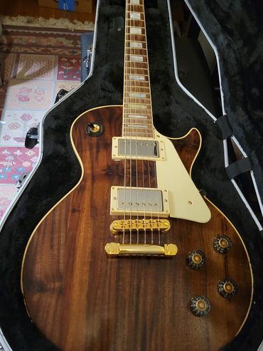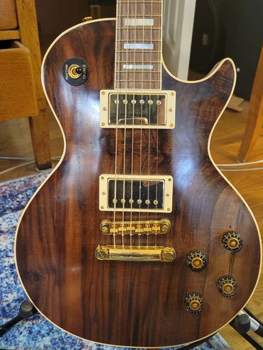 First Pandemic build. Solid carved Walnut top. Oak body and neck. Rosewood fretboard. Gold Gotoh Hardware. Gold Evo Frets. Dual Parson Street Gold Humbuckers.